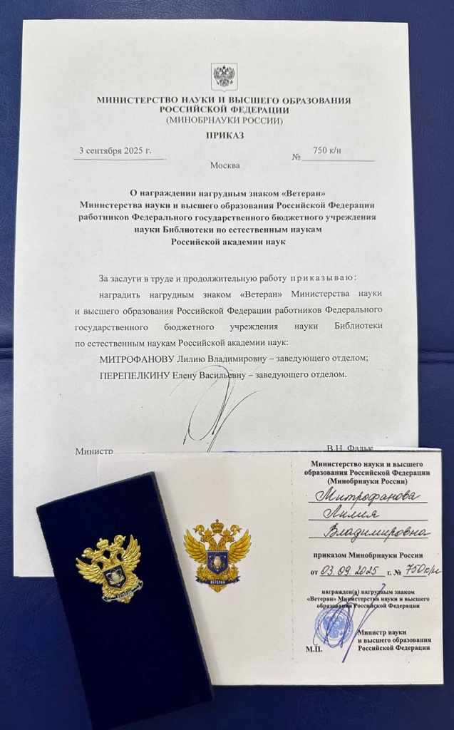 8 октября врио директора БЕН РАН Олег Олегович Махно торжественно вручил  Митрофановой Лилии Владимировне - заведующему справочно-библиографическим отделом БЕН РАН, нагрудный знак «Ветеран» Министерства науки и высшего образования Российской Федерации (приказ 750 к/н от 03.09.2025 за подписью министра В.Н. Фалькова) - за заслуги в труде и продолжительную работу.