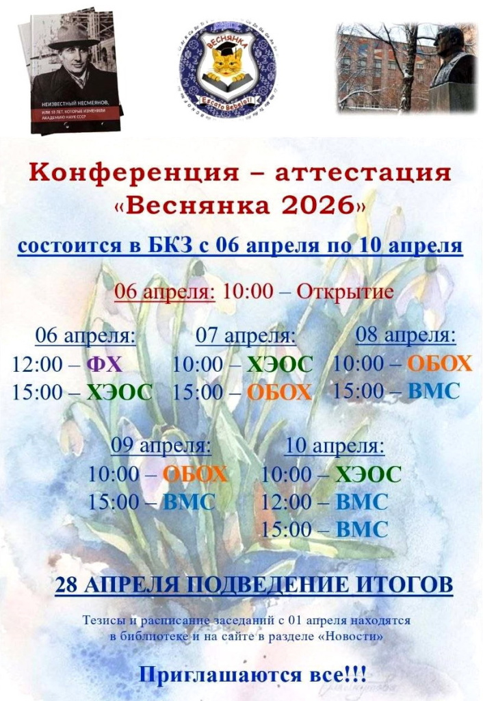 3 апреля в отделе БЕН РАН в Институте элементоорганических соединений им. А.Н. Несмеянова РАН открылась выставка "Веснянка-2026", на которой представлены тезисы докладов и расписание заседаний традиционной апрельской учебно-научной конференции-аттестации «Веснянка-2026».