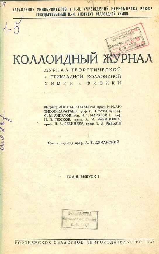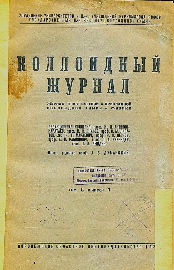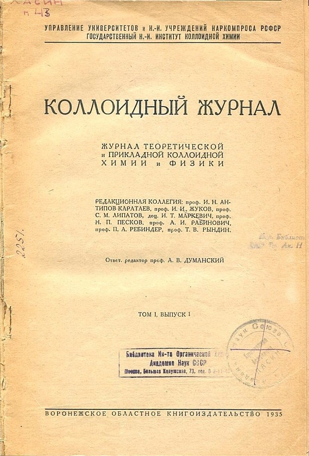 Первый номер Коллоидного журнала был подписан к печати 14 мая 1935 г., в него вошли публикации по научным докладам первой Всесоюзной конференции по коллоидной химии, состоявшейся в ноябре 1934 года в Воронеже (Типография издательства "КОМУННА", г. Воронеж).