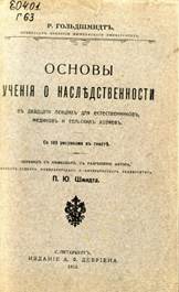Гольдшмидт, Рихард. / Рихард Гольдшмидт ; перевод с немецкого С. Л. Соболя ; предисловие Н. К. Кольцова. — Москва : Гос. изд-во, [1929]. — VIII, 381 с. : ил. — (Природа и культура ; кн. 10). — (Современные проблемы естествознания).